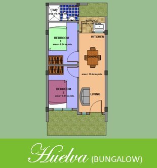 Huelva Bungalo Rowhouse Lot area : 36sq meters Floor area: 27.98sq meters 2 Bedrooms, 1 Toilet & Bath Living, Dining, Kitchen, Service Area Price: PhP 751,000.00 |